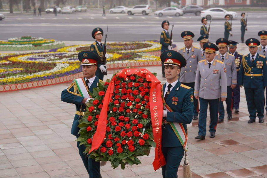 Возложение цветов к памятнику Исмоили Сомони в честь 33-й годовщины Вооружённых Сил