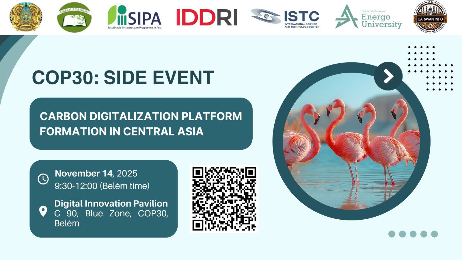 Научно-образовательный центр “Зеленая академия” в сотрудничестве с Министерством экологии и природных ресурсов Республики Казахстан, при поддержке МНТЦ, 14 ноября 2025 года проведет параллельное мероприятие на тему “ *Формирование цифровой платформы для углеродного рынка в Центральной Азии”* в павильоне цифровых инноваций, C90, Голубая зона, COP30, Белен.