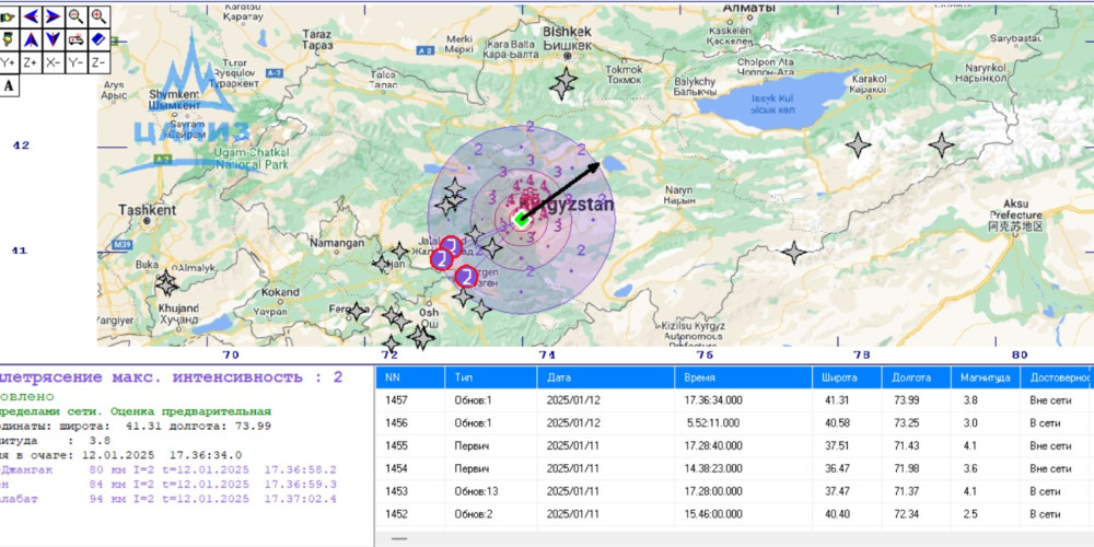 Кыргызстандын аймагында жер титирөө катталды, деп кабарлайт Өзгөчө кырдаалдар министрлигинин басма сөз кызматы. КР Сейсмология институтунун маалыматына ылайык, жер титирөө 12-январда саат 23:36да катталып, очогунда күчү 3 баллга жеткен.Силкинүү Жалал-Абад облусунун Сузак районундагы Жийде, Чангет айылдарында 3 баллга, Ак-Терек айылында 2,5 баллга, Токтогул районунун Ничке-Сай айылында 2,5 баллга, Ош облусунун Өзгөн...