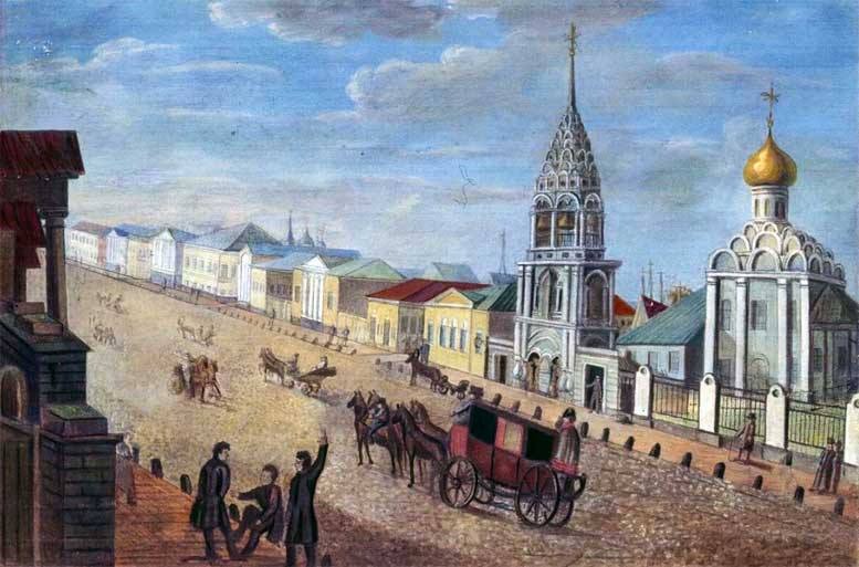 Фото: Вид на улицу Арбат. Картина худ. В. Нечаева (1830–1840) из экспозиции мемориального музея-квартиры А.С. Пушкина. На картине изображена Церковь Николая Чудотворца (“Николы Явленного”)
