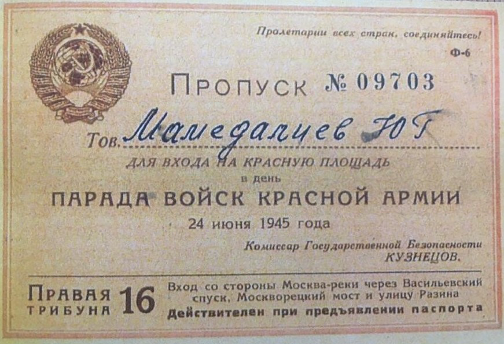 - Крупные научные успехи и яркие заслуги Мамедалиева в годы войны были отмечены не только орденами и государственными наградами, ему был вручен пропуск-приглашение для прохода на главную трибуну в Кремле во время Парада Победы (специальный пропуск № 09703). Это знаменательное событие является феноменальным фактом, не свойственным тому времени. Знаменитый учёный принимал Парад Победы на Красной площади в Москве.