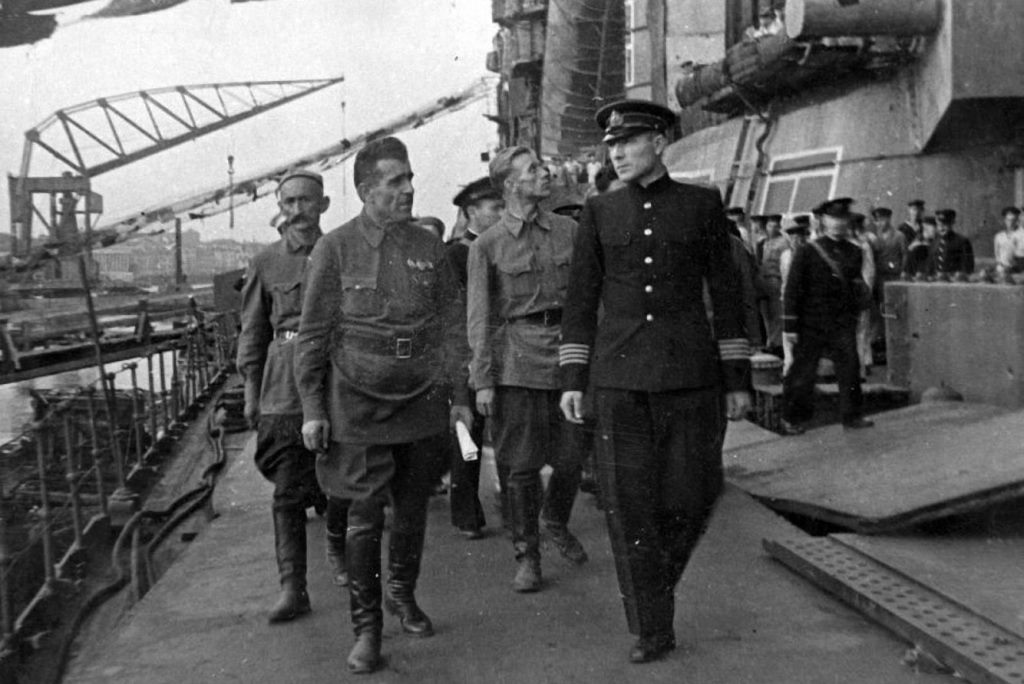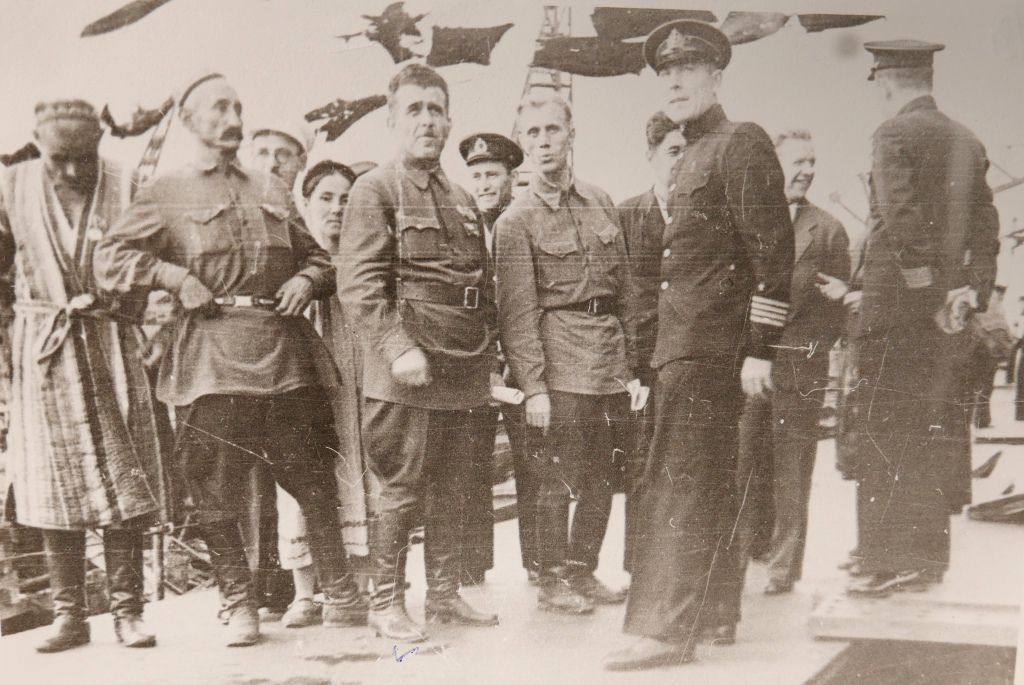Ҳайати намояндагони халқи тоҷик дар саҳни киштии ҷангии «Инқилоби Октябр», Ленинград, соли 1942. Аз бойгонии шахсии Ғафур Шерматов