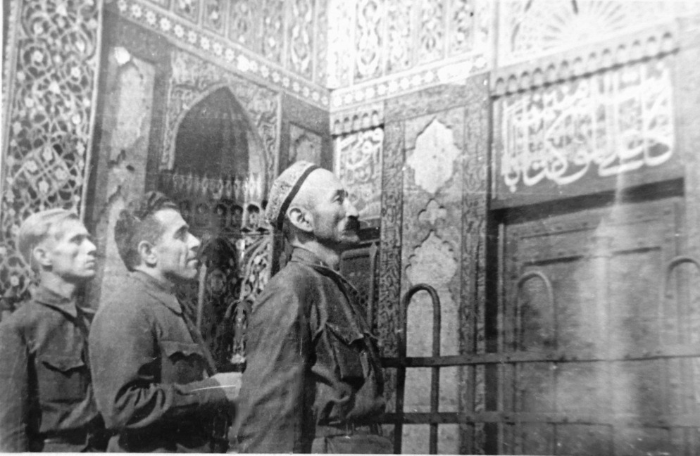 Раиси Президиуми Шӯрои Олии ҶШТ Мунаввар Шағодаев дар масҷиди ҷомеи шаҳри Ленинград, августи соли 1942. Аз архиви шахсии Ғафур Шерматов