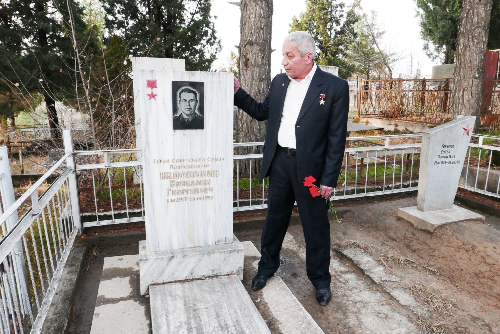 Қаҳрамони Иттиҳоди Шӯравӣ аз Тоҷикистон, полковник Набӣ Акрамов, ветеран ва иштирокчии 201-ум МСД, дар назди қабри Қаҳрамони Венямин Недошивин – иштирокчии рахнаи муҳосираи Ленинград, ки дар боғи қаҳрамонони байналмилалисти марказии шаҳри Душанбе дафн шудааст, арҷгузорӣ мекунад. Аз бойгонии шахсии Ғафур Шерматов