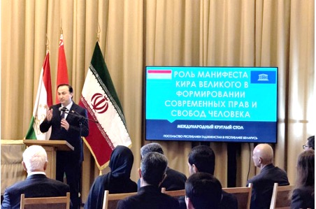 Душанбе, 20 март, – АИ «Корвон Иттилоот». Беш аз 2500 сол қабл санаде эҷод шуд, ки то ҳол ҷомеаи ҷаҳониро ба ҳимояи ҳуқуқ ва озодиҳои инсон илҳом мебахшад. Дирӯз дар Минск меросии таърихии мазкур дар мизи мудавварии байналмилалӣ бо ташаббуси Сафорати Ҷумҳурии Тоҷикистон дар Беларус баррасӣ шуд.
