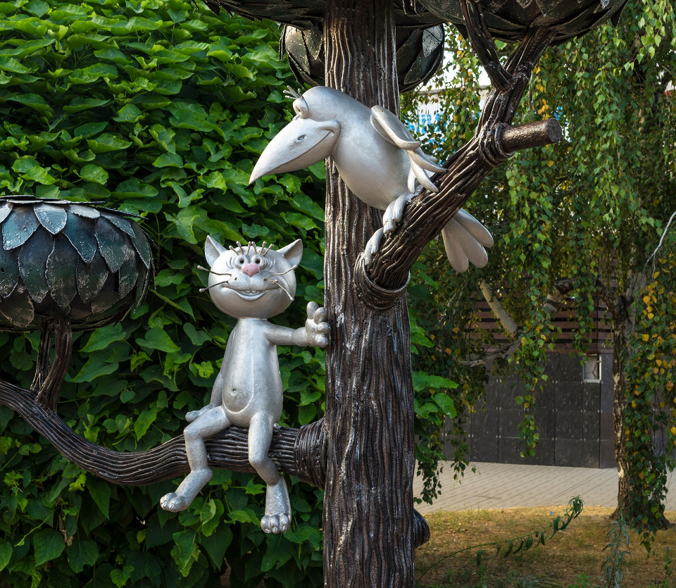 Забавный и трогательный памятник героям популярного советского мультфильма — котёнку Василию и вороне. Установленный в 2003 году, он быстро стал одним из самых любимых и фотографируемых объектов города. Существует поверье: чтобы желание сбылось, нужно потереть коту ус или нос.
