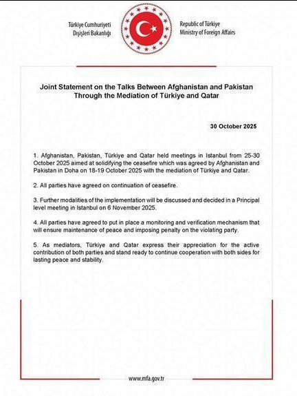 АФГАНИСТАН, 31 октября 2025г. - ИА Караван Инфо. МИД Турции выпустил заявление о ходе переговоров между Пакистаном и Афганистаном: «1. Афганистан, Пакистан, Турция и Катар провели встречи в Стамбуле с 25 по 30 октября 2025 года, направленные на укрепление режима прекращения огня, который был согласован Афганистаном и Пакистаном в Дохе...
