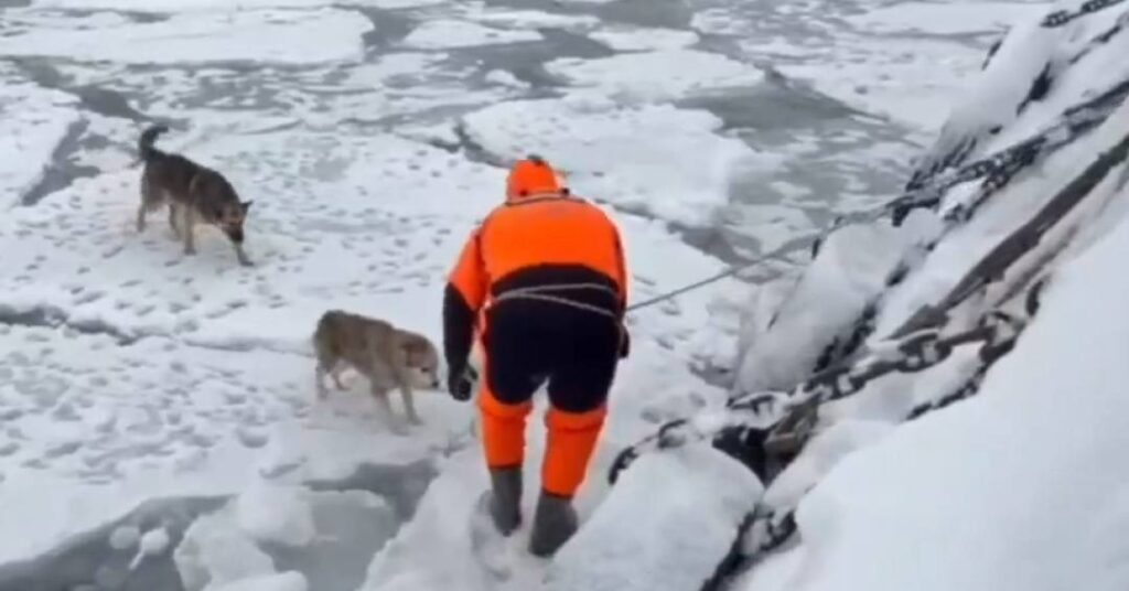 Для операции был задействован проходящий военный буксир. Спасатель в гидрокостюме спустился на льдину и поднял собак на борт.