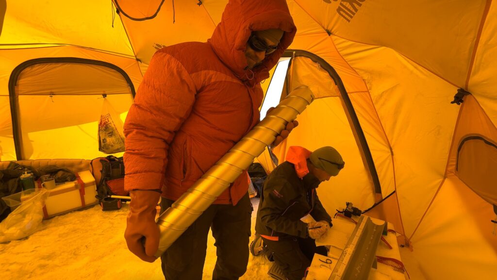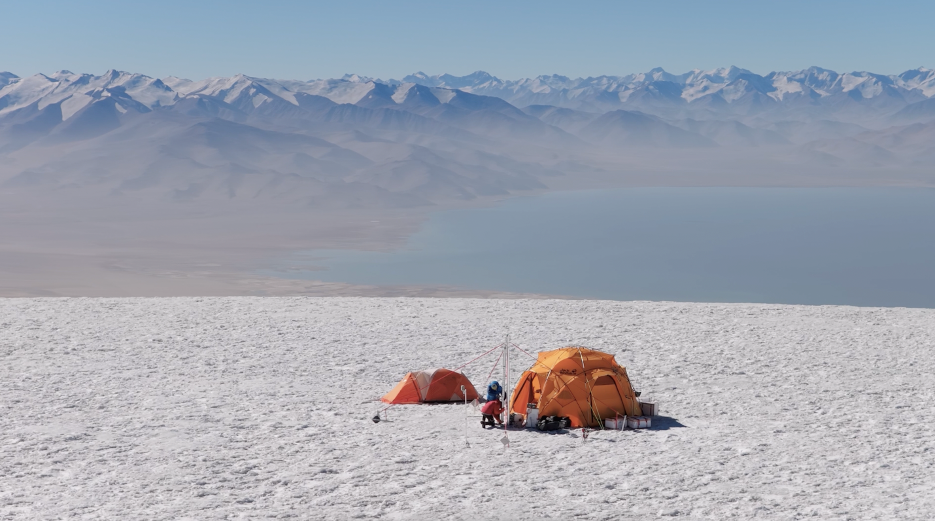 Олимон дар ҷараёни экспедитсияи PAMIR назди хаймаҳо бар рӯи сарпӯши яхини Кон-Чукурбашӣ, соли 2025. Акс: pamir-project.ch